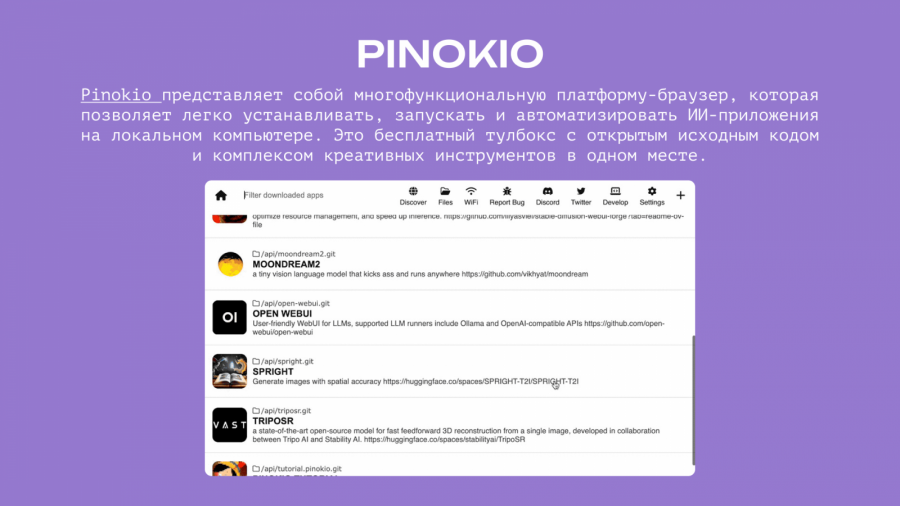 Pinokio представляет собой многофункциональную платформу-браузер, которая позволяет легко устанавливать, запускать и автоматизировать ИИ-приложения на локальном компьютере. Это бесплатный тулбокс с открытым исходным кодом и комплексом инструментов в одном месте.