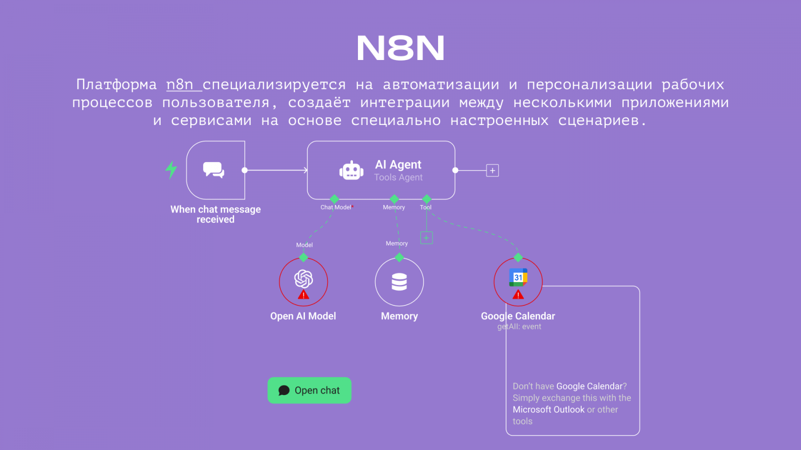 Платформа n8n специализируется на автоматизации и персонализации рабочих процессов пользователя, создает интеграции между несколькими приложениями и сервисами на основе специально настроенных сценариев.