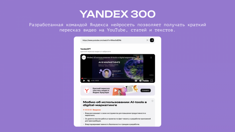 Yandex 300 способна обрабатывать тексты объемом до 30 тыс. знаков и видеоматериалы длительностью от двух минут до четырех часов. При работе с видео алгоритм сначала преобразует аудиодорожку в текст с помощью распознавания речи, а затем нейросеть разбивает полученный материал на смысловые фрагменты и обобщает каждый из них с указанием кликабельных тайм-кодов.