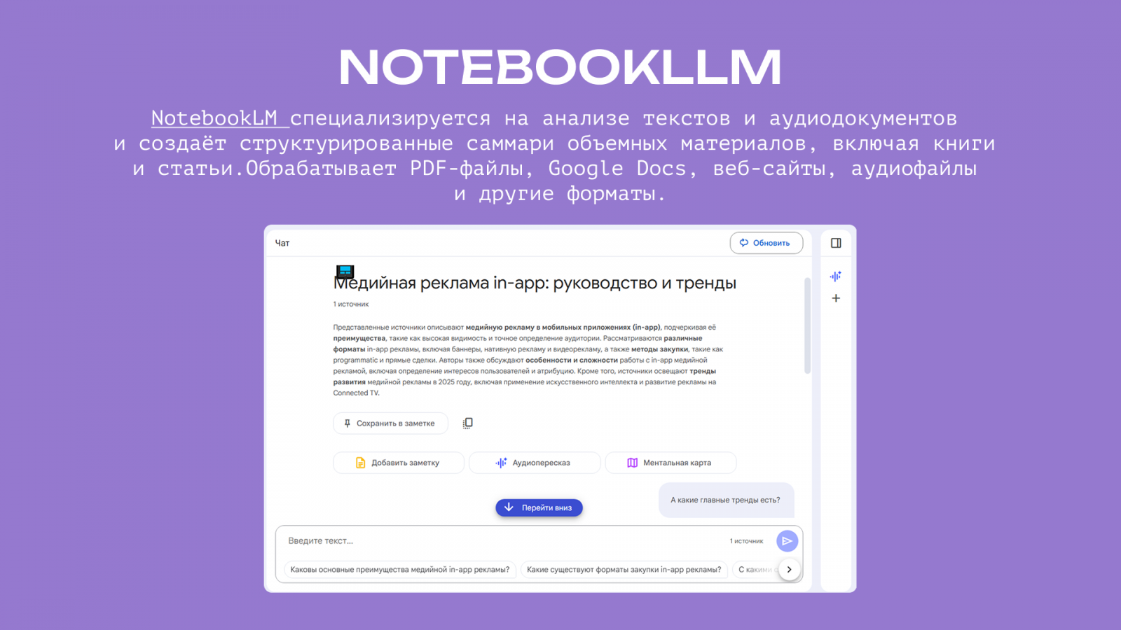 NotebookLLM специализируется на анализе текстов и аудиодокументов и создает структурированные саммари объемных материалов, включая книги и статьи. Обрабатывает PDF-файлы, Google Docs, веб-сайты, аудиофайлы и другие форматы. Как и в других моделях, здесь есть чат — можно запросить цитаты, ссылки на разделы источника, откуда модель брала информацию, задавать вопросы содержанию.