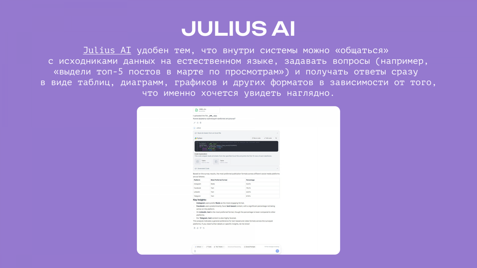 Julius AI удобен тем, что внутри системы можно «общаться» с исходниками данных на естественном языке, задавать вопросы (например, «выдели топ-5 постов в марте по просмотрам») и получать ответы сразу в виде таблиц, диаграмм, графиков и других форматов в зависимости от того, что именно хочется увидеть наглядно. Все это может помочь специалистам в получении инсайтов, интерпретации данных, оптимизации маркетинговых кампаний, прогнозировании.