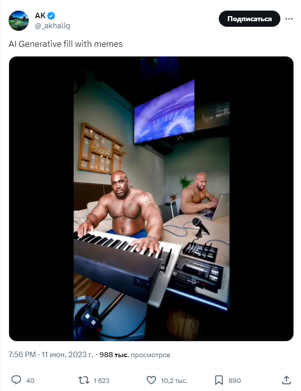 Продолжая тему картинок, хочется затронуть Photoshop с «умной заливкой» (Generative Fill). Эта функция может дополнять недостающие фрагменты изображения, и энтузиасты начали смотреть, что находится за рамками популярных мемов. Результат некоторых генераций удивил своей правдоподобностью, а некоторые просто повеселили.