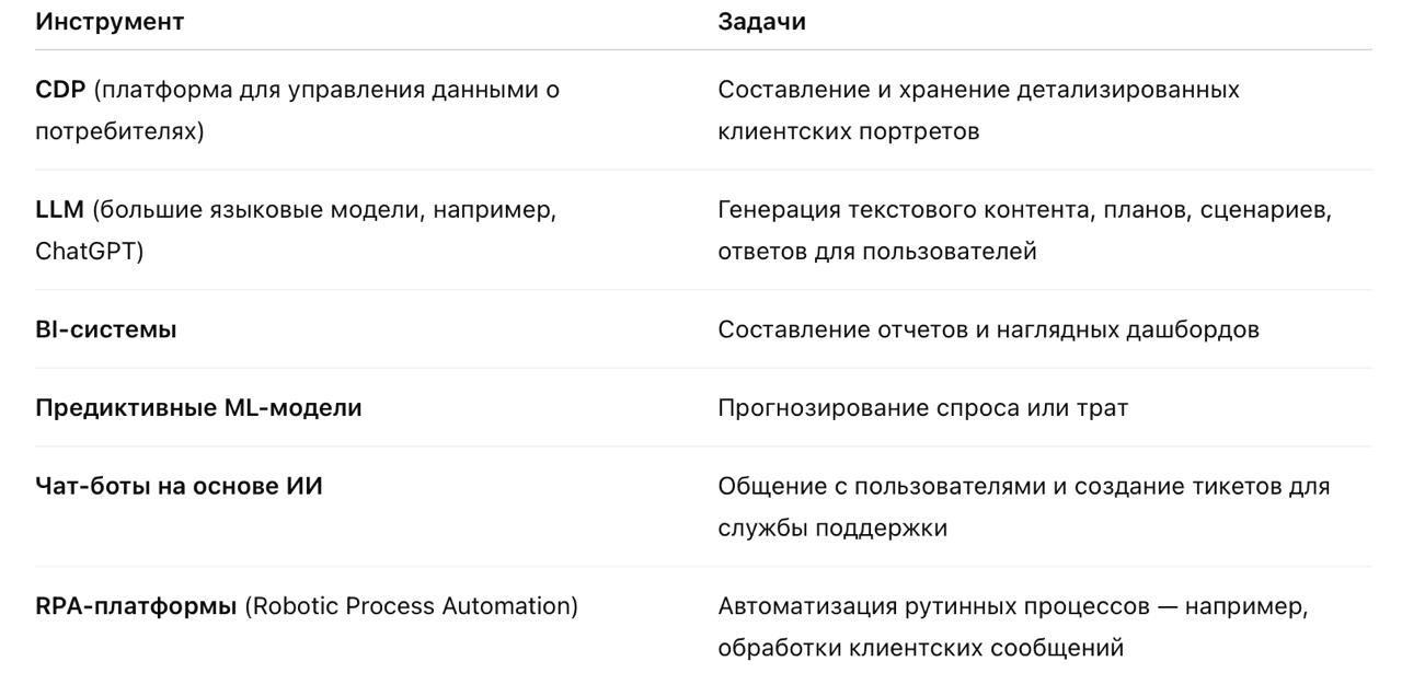 Но чтобы все работало максимально эффективно, нужно сформировать AI-стек — совокупность интегрированных друг с другом AI-инструментов, которые действуют по единой логике и в соответствии с заданной стратегией. Для этого необходимо определиться, для каких задач использовать нейросети, и как связать их между собой.