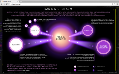 «Индекс» складывается из данных четырех основных источников: это анализ постов из социальных сетей по ключевым словам, новости, погода и сообщения о причинах счастья, которые оставляют пользователи на сайте проекта. В результате, на интерактивной карте можно увидеть уровень счастья страны в целом, отдельных регионов и даже свой собственный.