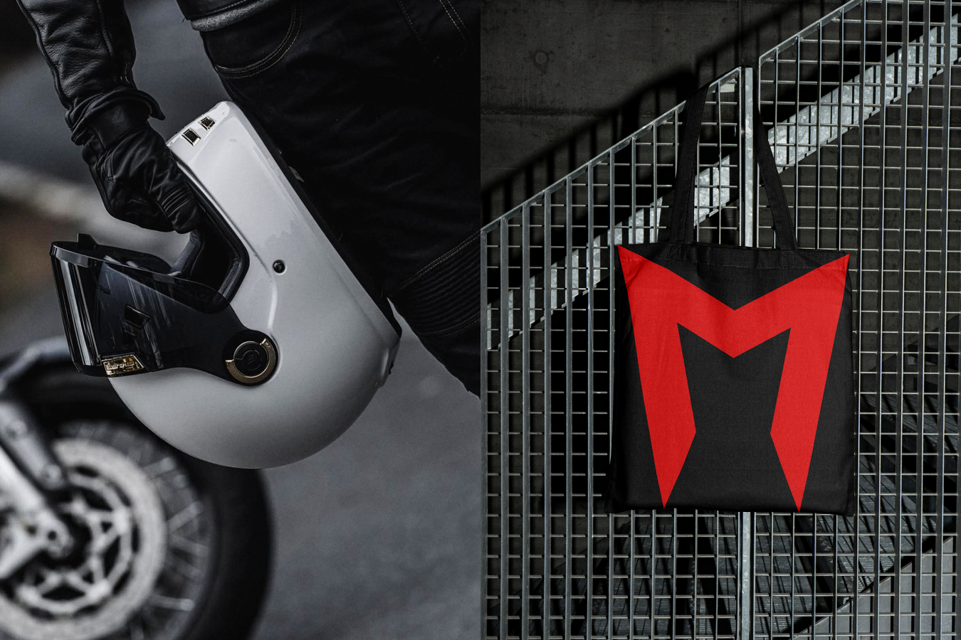 Ключевым элементом айдентики стал яркий и выразительный логотип. Он представляет собой шрифтовую композицию и символ в виде стилизованной буквы «м», которая одновременно отсылает к силуэту мотоциклиста, мото-шлему и фирменному персонажу бренда — коту-маскоту.