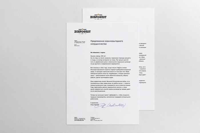 Ohmybrand разработало айдентику для рыбопромысловой компании «Доброфлот», которая ежегодно добывает и перерабатывает свыше 40000 тонн рыбы. Руководство концерна решило, что гигантские показатели должны находить свое отражение в позиционировании концерна как современной группы компаний.