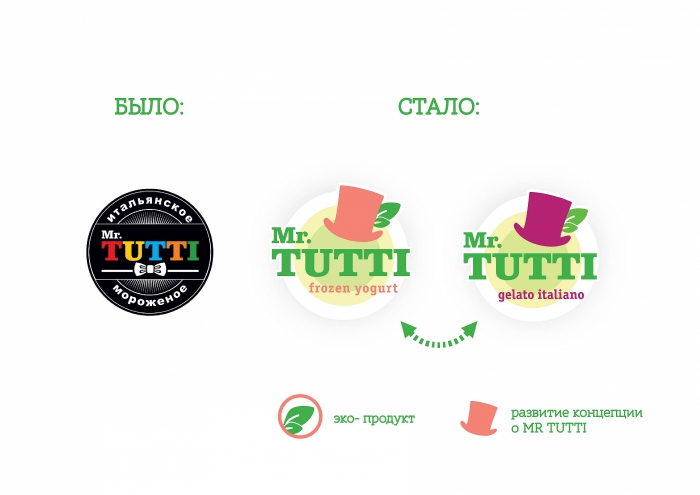 В рамках работы над проектом была скорректирована стратегия позиционирования, был разработан логотип и фирменный стиль бренда. Рестайлинг логотипа был проведен на основе анализа конкурентной среды с целью усиления ключевых посылов бренда и его максимальной индивидуализации в конкурентной среде. Так специалисты Golden Marrow приняли решение усилить акцент на привязке к персоне Mr.Tutti в названии и логотипе соответственно.