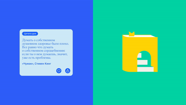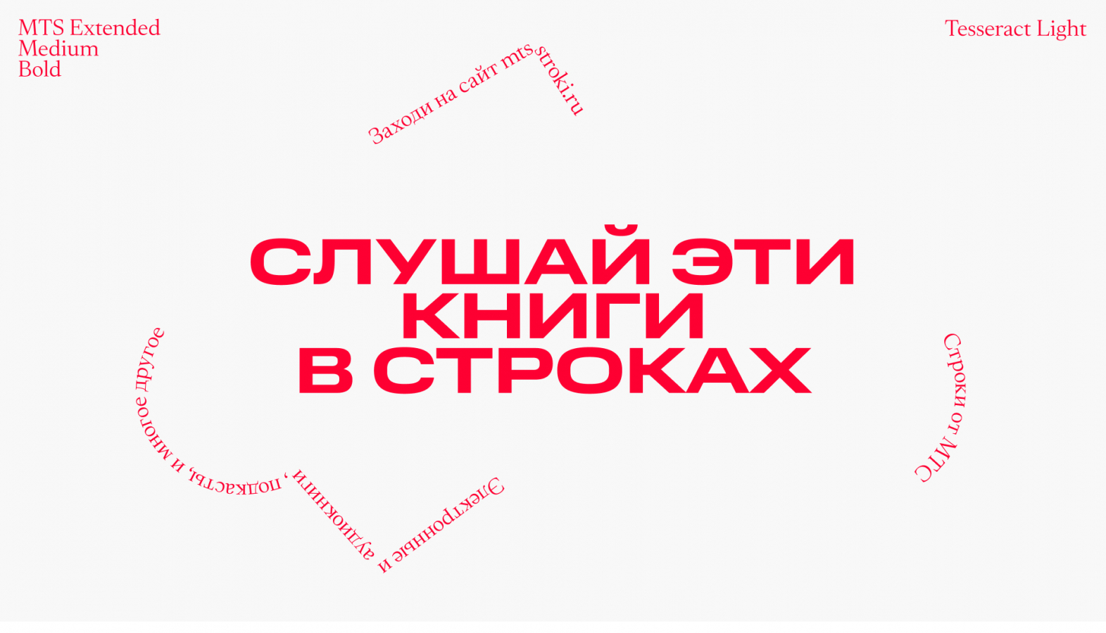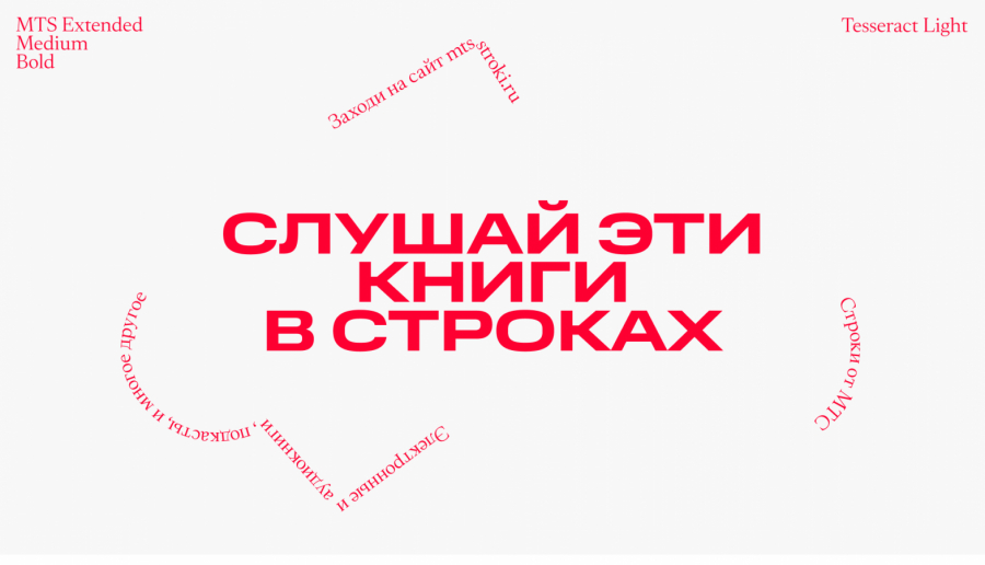 Основой идентичности бренда стала шрифтовая пара из болдового диджитального МТС Sans Extended, и тонкой классической антиквы Tesseract, которая ассоциируется с книжной типографикой. Это помогает создать связь между цифровой средой приложения и миром печатных книг, считают дизайнеры. «Антиква привлекает больше внимания к тем самым строкам внутри макетов, текст на которых может стать «пасхалкой», отсылающей к сюжету книги или дополняющей смысловое содержание макета», — отмечают они.