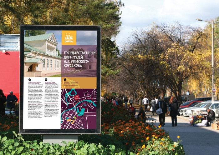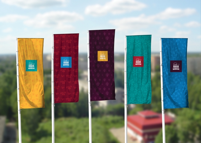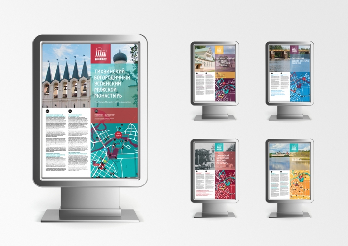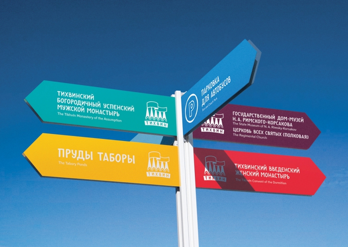 При разработке фирменного стиля дизайнеры использовали цифру «5» по аналогии с количеством башен Тихвинского монастыря. Цветовая гамма айдентики также выполнена в пяти ключевых цветах: желтый, алый, фиолетовый, бирюзовый, голубой.