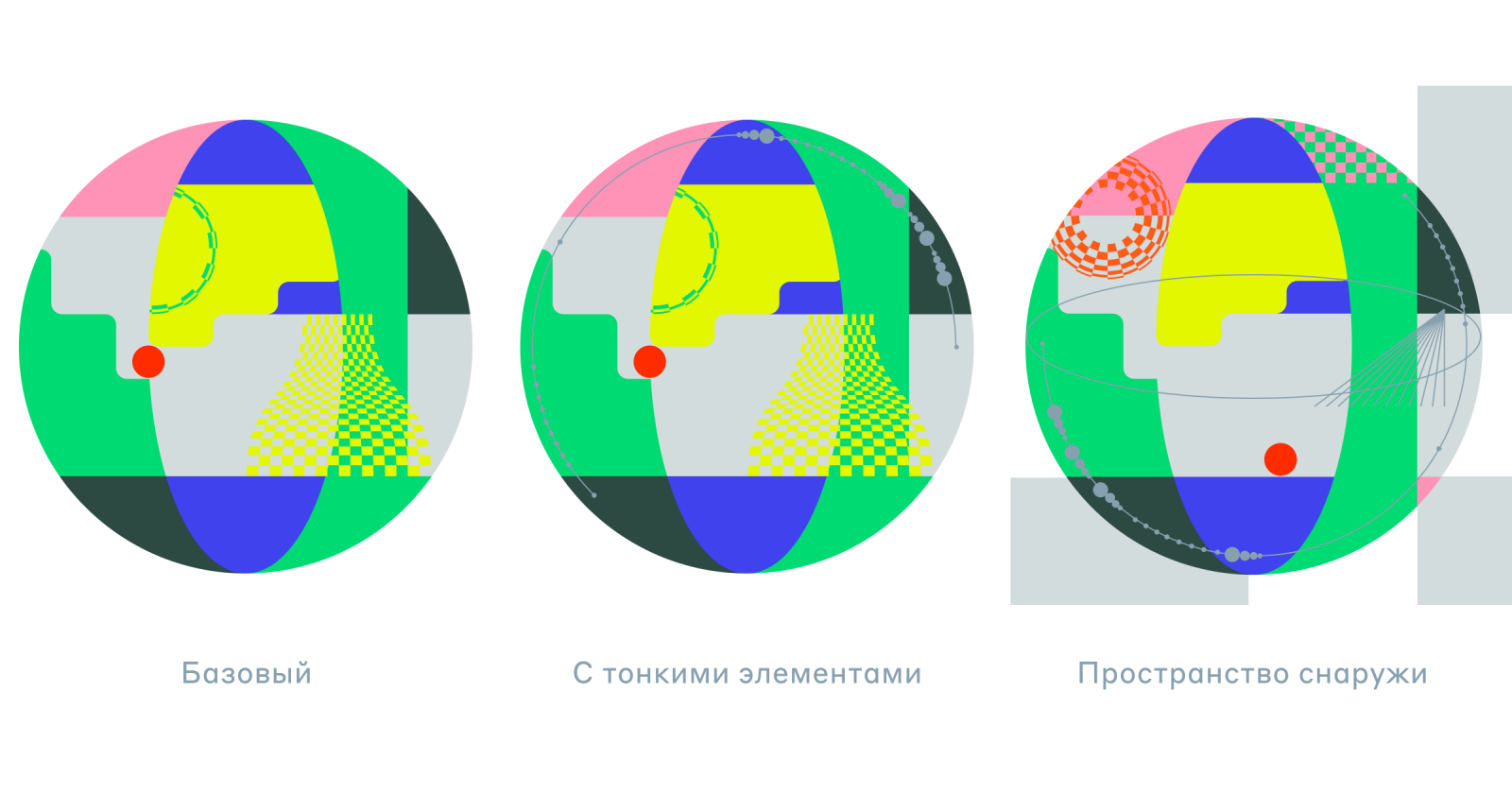 Палитра с равной цветовой пропорцией формирует тональность и характер бренда: технологичный, устремлённый в будущее, но доступный, остроумный, энергичный и заботливый. Смещая же пропорцию в сторону одного из трёх ведущих цветов, мы делаем акцент на особенностях направления и на его собственном уникальном характере.