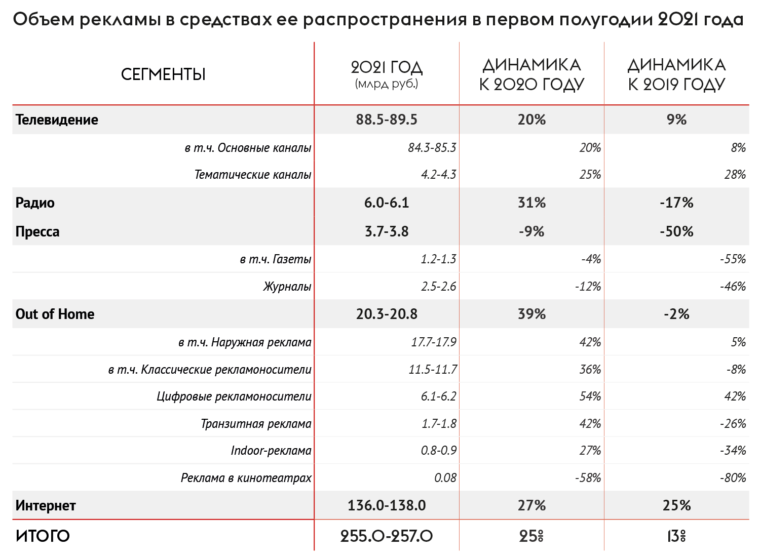 Различные медиасегменты развивались крайне неравномерно, отмечает вице-президент АКАР, сопредседатель комиссии экспертов АКАР и директор по маркетинговым исследованиям Аналитического центра НСК Сергей Веселов. Наиболее пострадавшие во время кризиса сегменты радио и наружной рекламы выросли, соответственно, на 31% и 39% относительно 2020 года, обогнав традиционно лидирующие телевидение и интернет (рост на 20% и 27% соответственно).