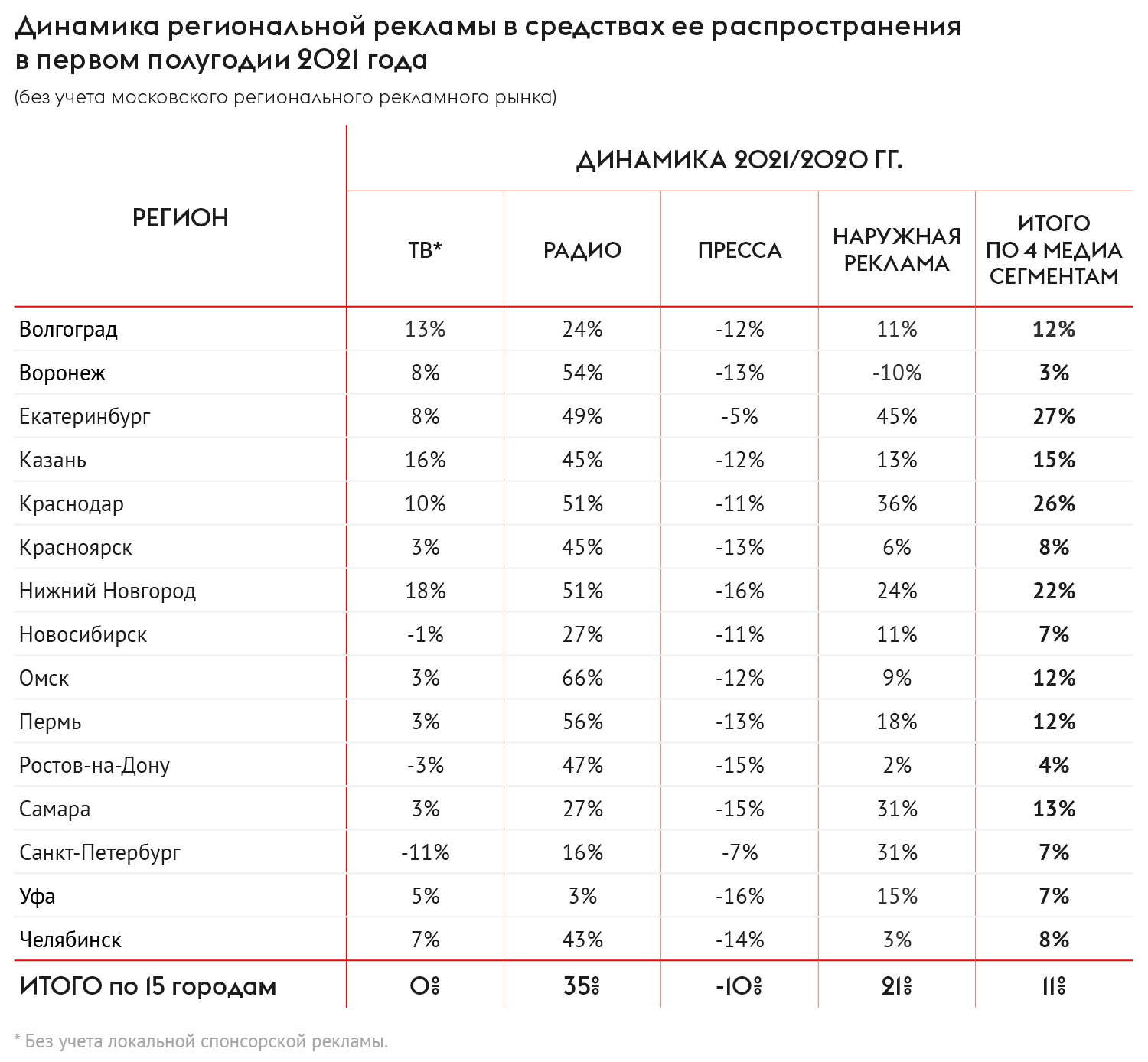 Ситуация на отечественном рынке региональной рекламы выглядит не столь впечатляющей. Да, к 2020 году региональный рынок вырос на 10%, но докризисному 2019 году он все еще уступает около 14%. При этом приятно отметить, что фактически все крупнейшие региональные рынки в 2021 году показали положительную динамику.