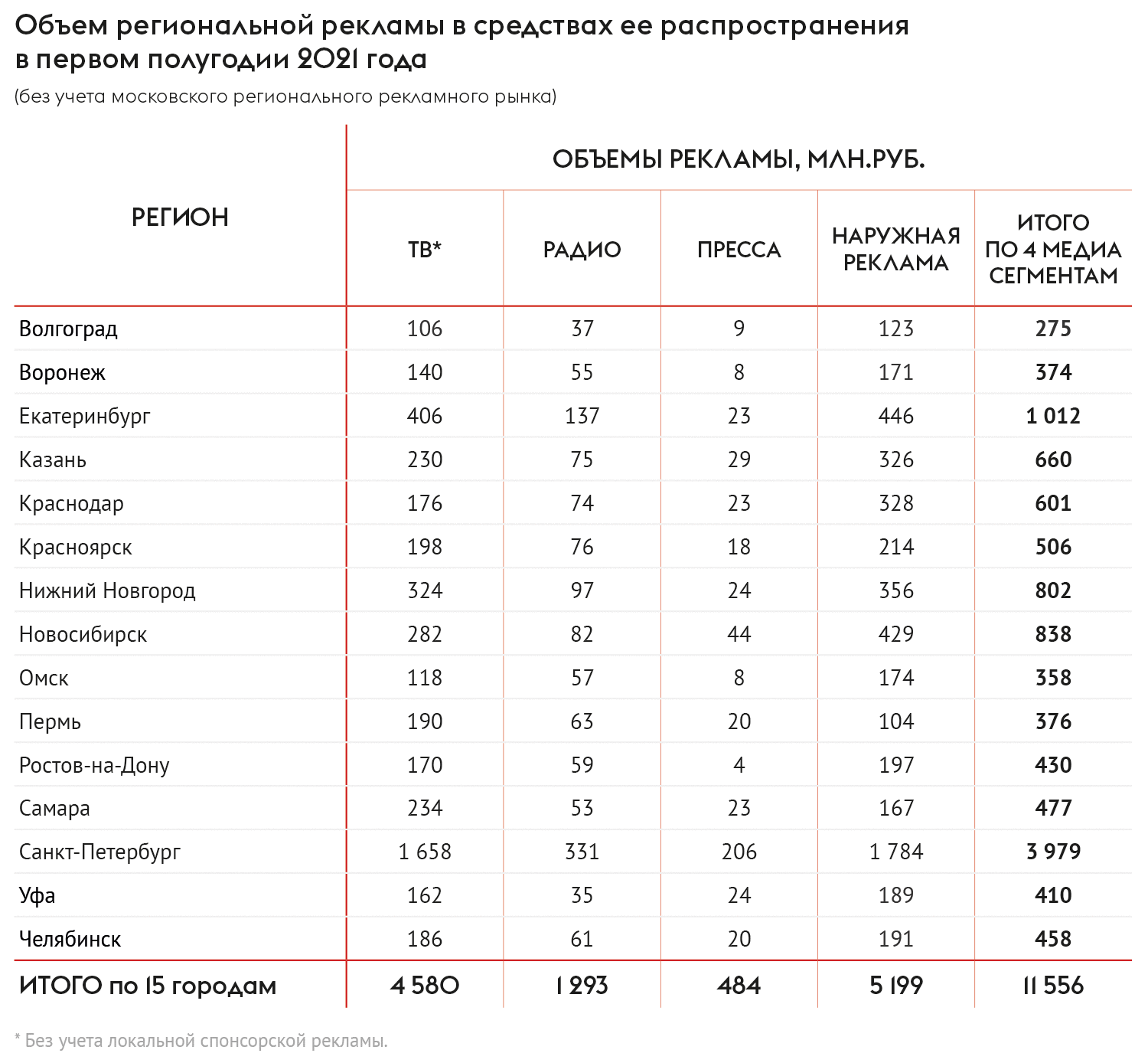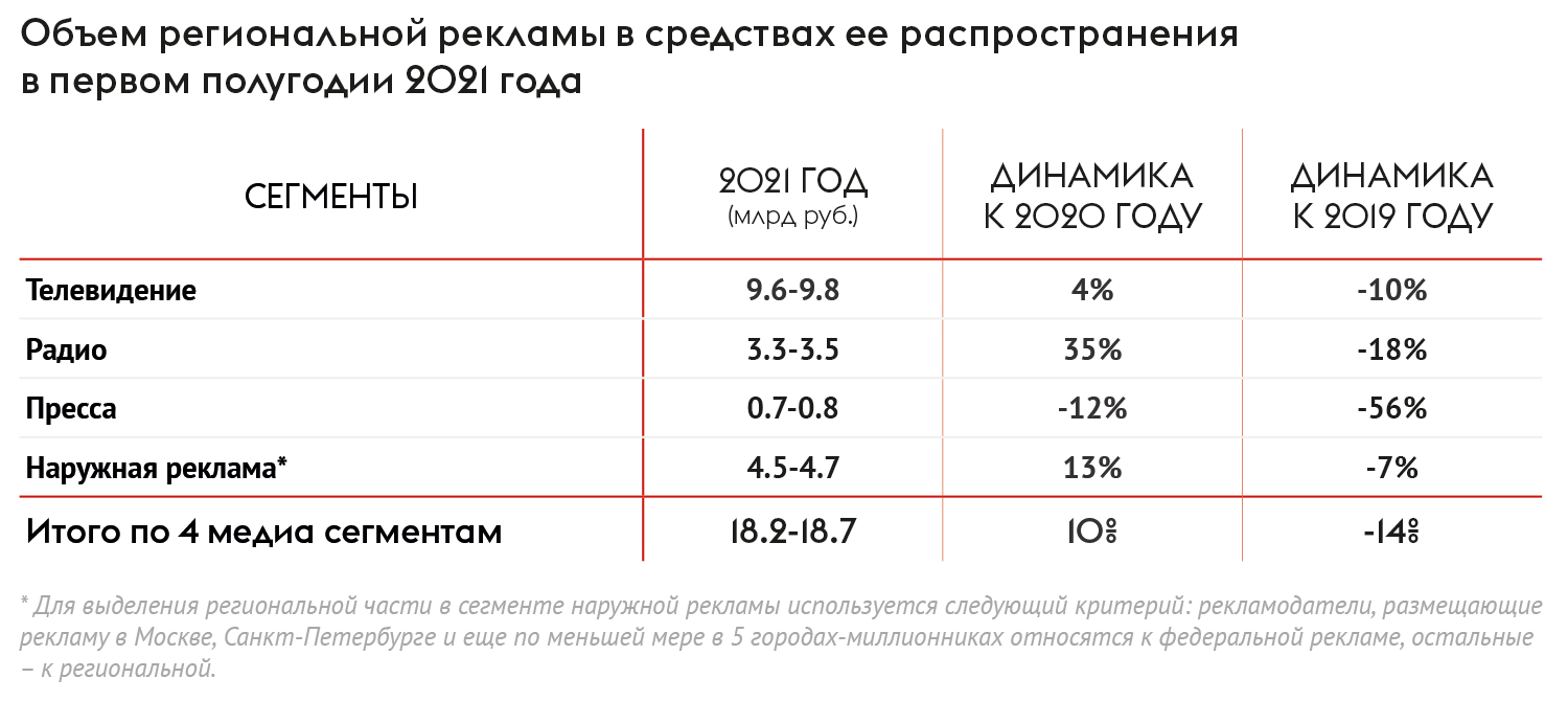Также эксперты АКАР оценили объем регионального рекламного рынка России. В расчет включены четыре медиасегмента (телевидение, радио, пресса и наружная реклама) и не учитывается московский регион. В наружной рекламе компании, размещающие рекламу в Москве, Санкт-Петербурге и еще минимум пяти городах-миллионниках относятся к федеральной рекламе, остальные — к региональной.