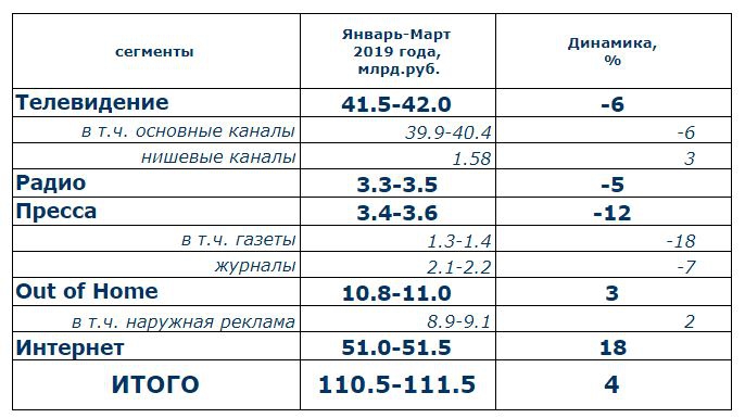Среди сегментов рост продемонстрировали только интернет (+18%) и Out of Home (+3%). На телевидении бюджеты сократились на 6%, на радио — на 5%, а пресса просела на 12%. Напомним, в первом квартале 2018 года отрицательная динамика наблюдалась только в печатных СМИ, остальные медиаканалы были в плюсе. Например, в прошлом году ТВ показывало рост на 13%.