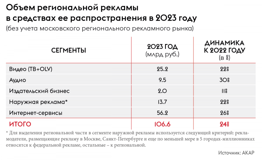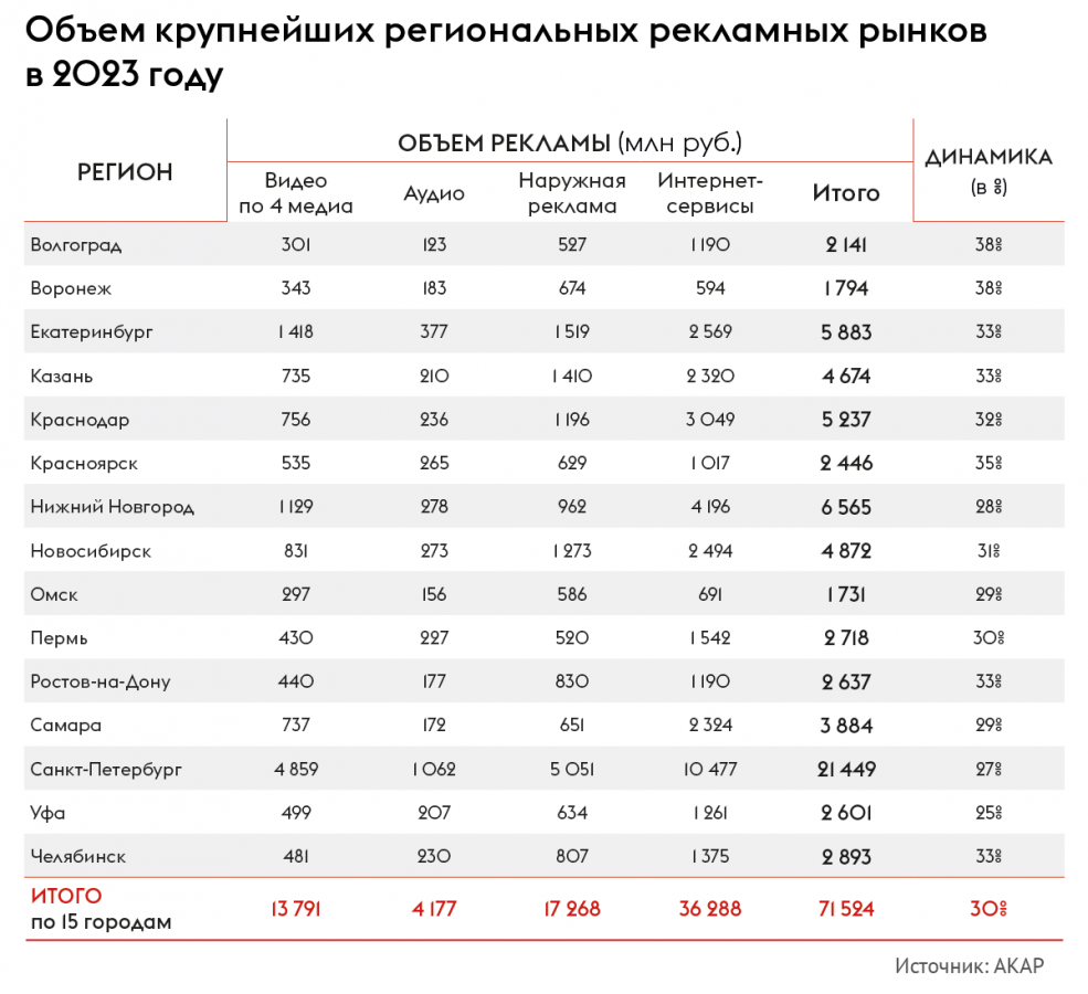 В АКАР также выделили и оценили ряд региональных рынков — в 15-ти крупнейших городах-миллионниках за исключением Москвы. Суммарный объем региональных рекламных бюджетов в рассматриваемых городах составил более 71,5 млрд руб. за вычетом НДС. На всех 15-ти рынках была зафиксирована положительная динамика в 20% и более процентов к показателям 2022-го. Объём четырех региональных рынков превысил 5 млрд руб., ещё трёх — оставил от 3 до 5 млрд руб.
