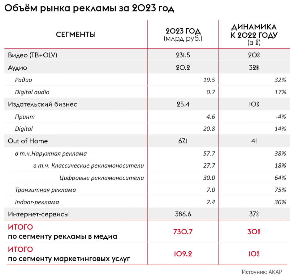 Ассоциация коммуникационных агентств России (АКАР) подсчитала объём рекламного рынка в России за 2023 год, используя новую методику оценки. Теперь в оценке АКАР нет традиционных ТВ, интернета, радио, прессы и наружки. Вместо них — видео, аудио, издательский бизнес, OOH и интернет-сервисы. Суммарно объём рынка составил почти 731 млрд руб., что на 30% больше, чем в 2022 году. Ещё одной важнейшей особенностью при оценке стало использование данных Единого реестра интернет-рекламы (ЕРИР), говорится в сообщении ассоциации, поступившем в Sostav.