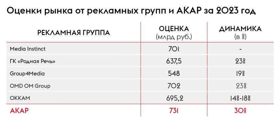 Sostav сравнил оценки рынка от рекламных групп без учёта e-com, озвученные ранее. Наиболее высокие показатели дали Media Instinct Group и OMD OM Group — 701−702 млрд руб. соответственно. Оккам в сентябре 2023 называл цифры в 695 млрд руб., ГК «Родная речь» в феврале 2024-го — в 637,5 млрд руб. Самые низкие показатели обозначила Group4Media — 548 млрд руб.