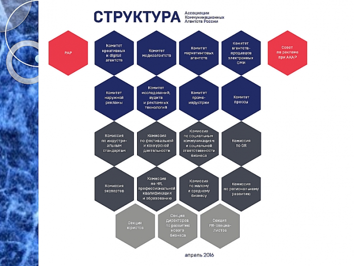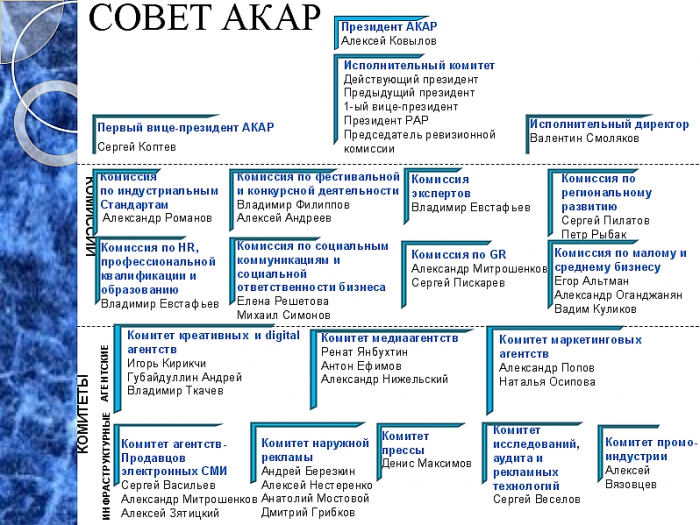 АКАР также обновила структуру ассоциации. В составе АКАР будут функционировать 8 комитетов, 8 комиссий и 3 секции. Изменения затронули Комитет по наружной рекламе и прессе с образованием самостоятельного комитета прессы. Также появилась две новых комиссии - комиссия по малому и среднему бизнесу и комиссия по региональному развитию.