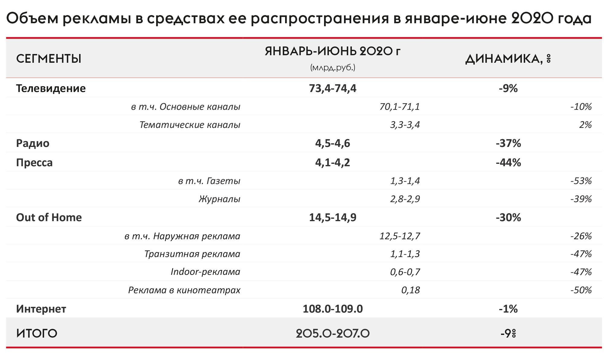 Бюджеты на телевидении упали на 9% — до 73,4−74,4 млрд руб., причем тематические каналы, в отличие от основных, сохранили положительную динамику — 2%. Эксперты считают, что такой результат был вполне ожидаемым. Как пояснил Герцев,с началом пандемии рекламодатели приняли решение о переносе бюджетов на осень, и это не могло не отразиться на цифрах второго квартала и полугодия в целом. «А что касается тематических каналов, то данные цифры показывают направление развития медиакоммуникации в сторону востребованного видеоконтента, этим и объясняется положительная динамика неэфирного ТВ», — указал он.
