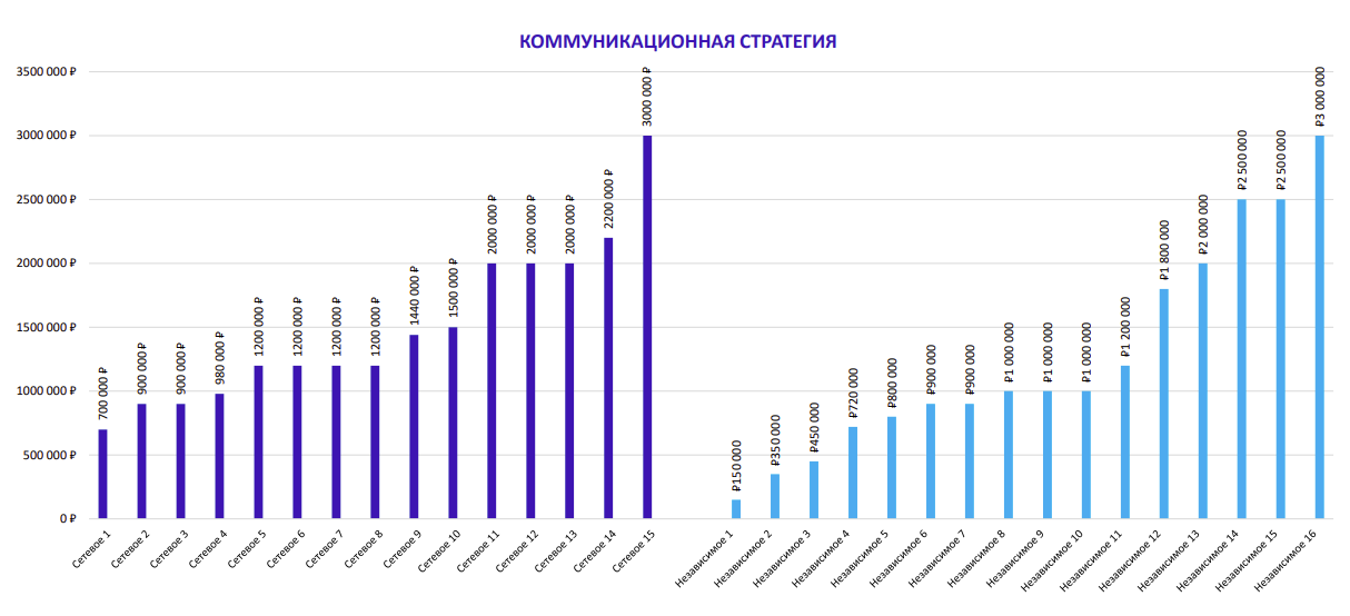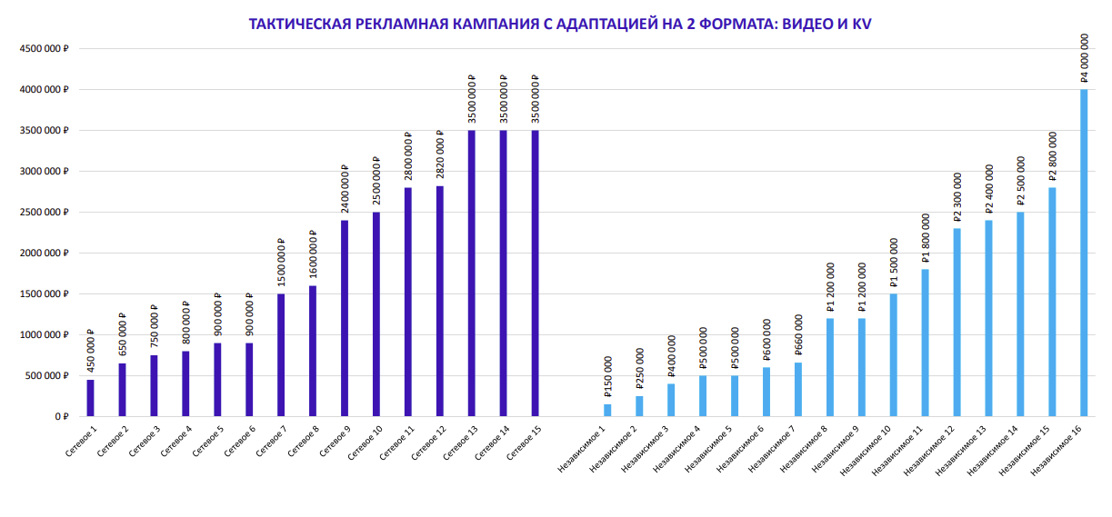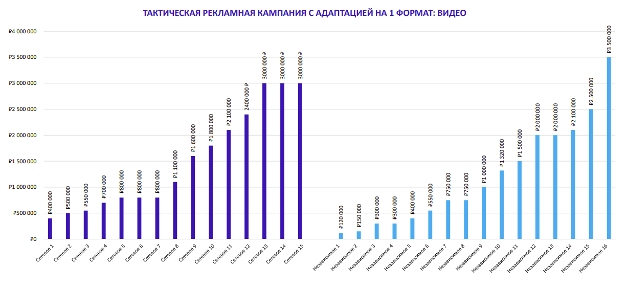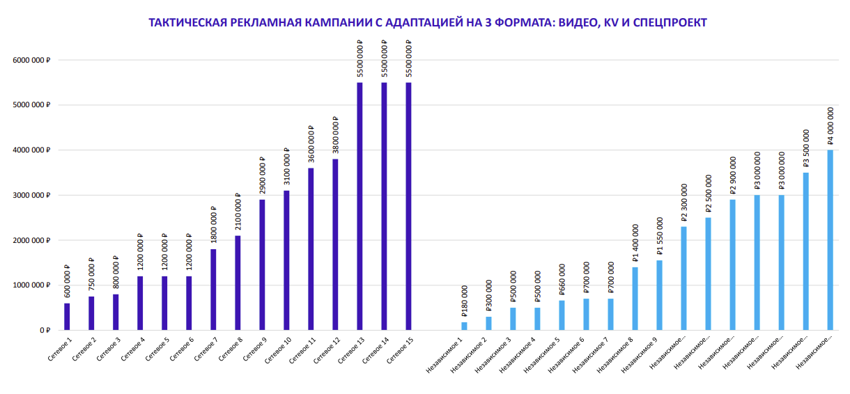 Как показывает опрос АКАР, среднерыночная стоимость разработки позиционирования бренда сетевыми агентствами составляет 1,8 млн рублей, коммуникационной стратегии — 1,5 млн рублей, Big Idea — 2,2 млн рублей, участие в тендере — 0,5 млн рублей. Стоимость создания идеи для тактической рекламной кампании с адаптацией на один формат — видео — достигает 1,5 млн рублей, с адаптацией на два формата — видео и кивижуал — 1,9 млн рублей, с адаптацией на три формата — видео, кивижуал и спецпроект — 2,6 млн рублей.