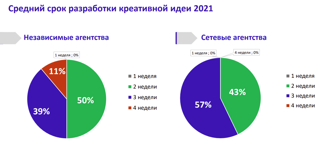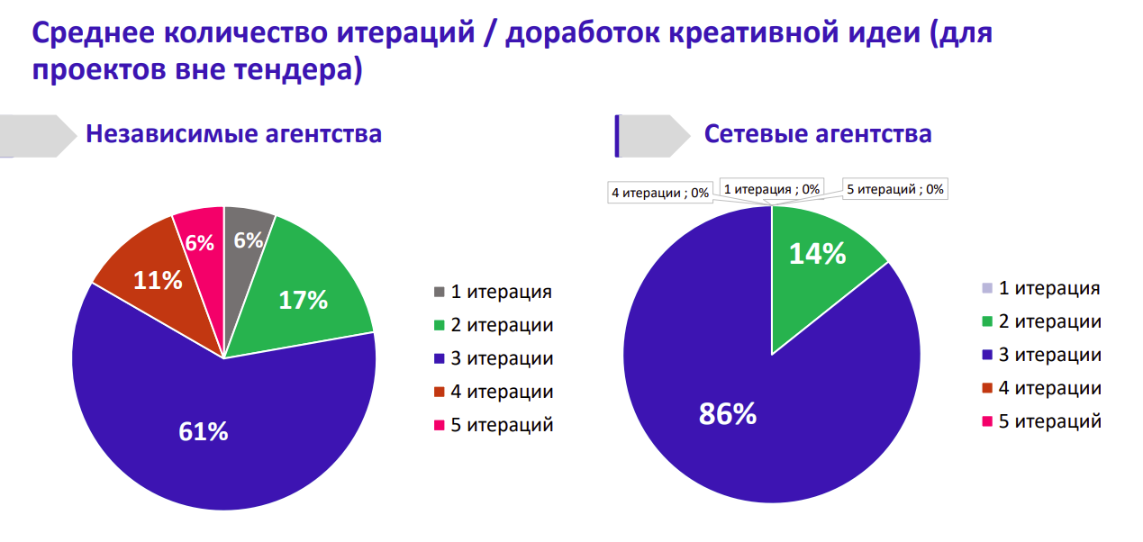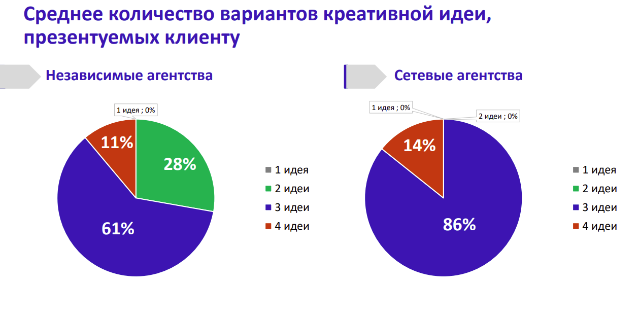 Что касается процесса реализации услуг, оказалось, что в среднем сетевые агентства презентуют клиентам больше вариантов креативных идей, чем независимые. Так 86% сетевых игроков представляют три идеи, 14% - четыре идеи. При этом среди независимых агентств три идеи обычно предлагают 61% опрошенных, четыре идеи — 11% и две идеи — 28%.