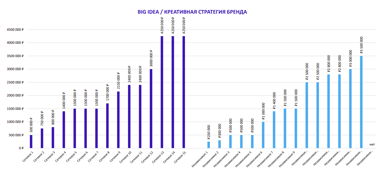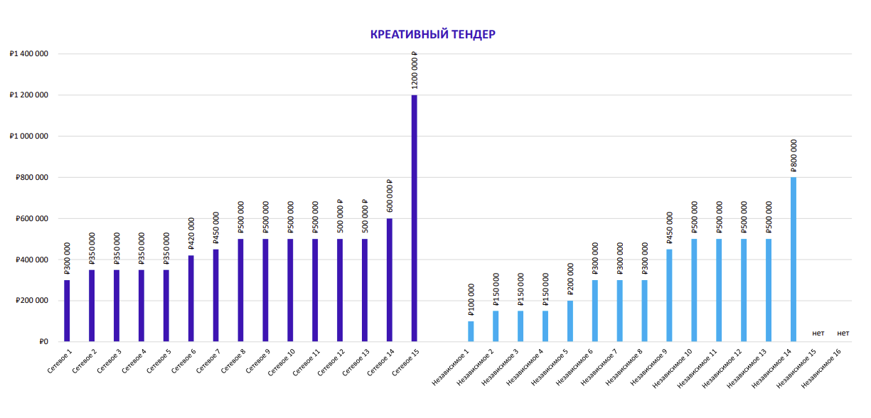 По результатам опроса независимых агентств было установлено, что средняя стоимость проработки позиционирования бренда равна 1,7 млн рублей, коммуникационной стратегии — 1,3 млн рублей, Big Idea — 1,6 млн рублей, участие в тендере — 0,4 млн рублей. Стоимость проработки идеи для кампании с адаптацией на один формат составляет 1,2 млн рублей, на два формата — 1,4 млн рублей, на три формата — 1,7 млн рублей.