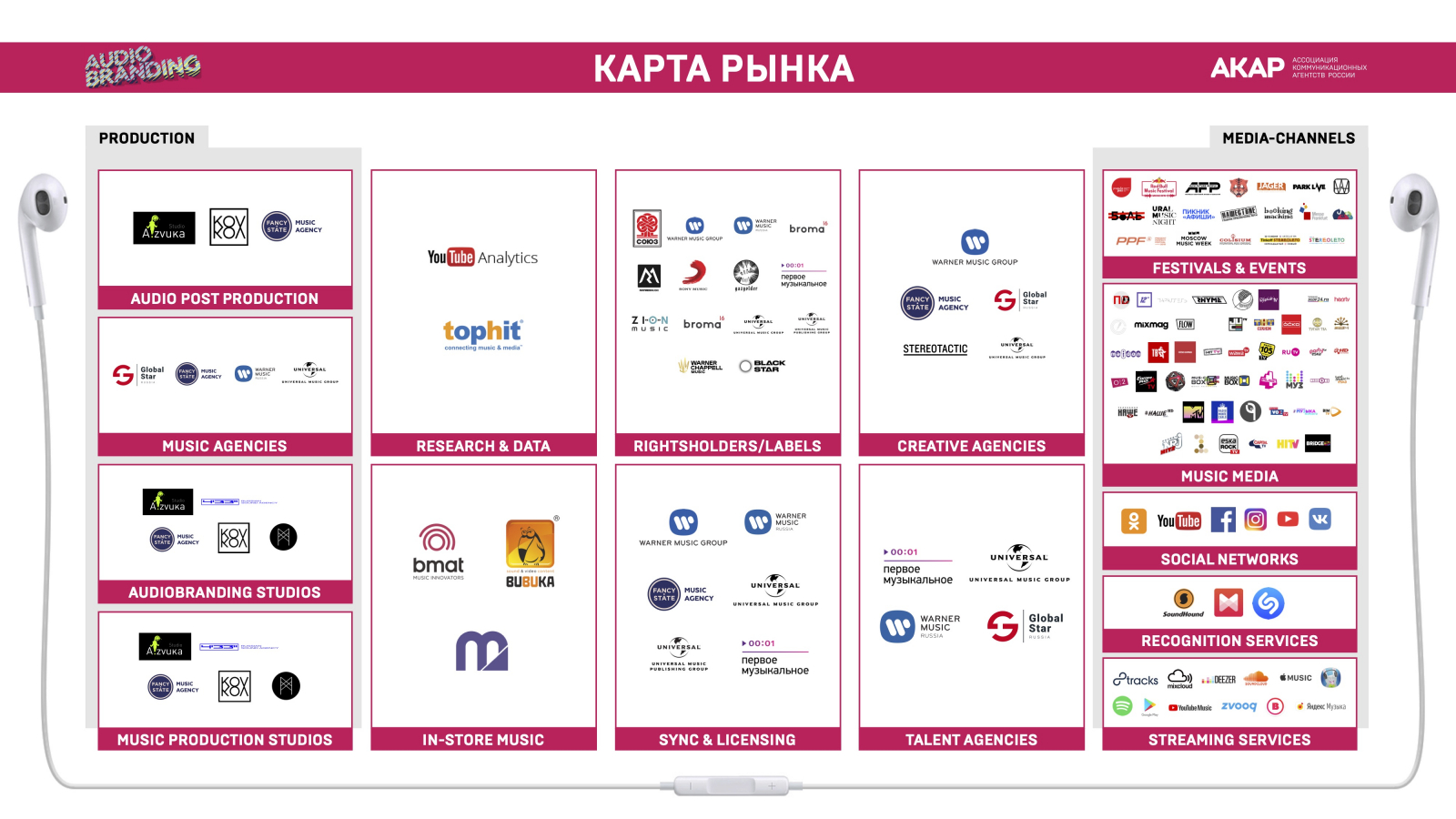 Аудиобрендинг — совокупность аудио-инструментов, используемых в маркетинговой коммуникации — от исследований и данных до размещения в специализированных каналах. Он также включает в себя производство любых форм аудиоконтента, лицензирование музыки и музыкальный инфлюенсер-маркетинг. Карта отражает общий ландшафт сферы аудиобрендинга и содержит основных игроков по каждому из сегментов. Она является первым шагом к систематизации рынка, направленным на повышение его прозрачности и культуры работы с аудио контентом в маркетинговой коммуникации.
