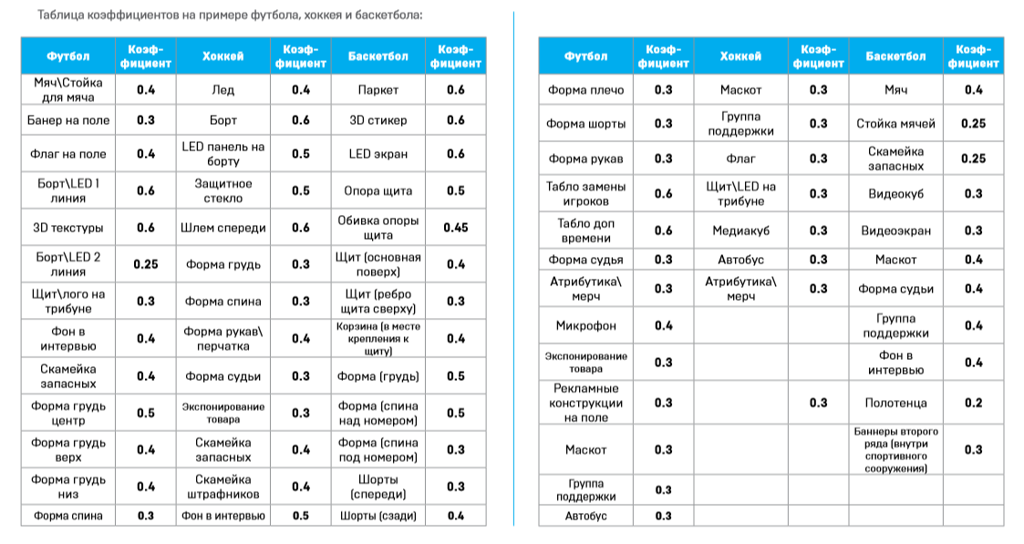 В рамках проведенных исследований были выявлены основные блоки, из которых традиционно складывается стоимость присутствия брендов в спорте в соответствии с решаемыми ими задачами: медийное присутствие, бизнес и промо возможности, интеллектуальные и имиджевые права, использование систем CRM и образов спортсменов. В каждом разделе описываются соответствующие инструменты воздействия на аудиторию, примеры использования спонсорских опций, источники информации для расчетов и принципы ценообразования.