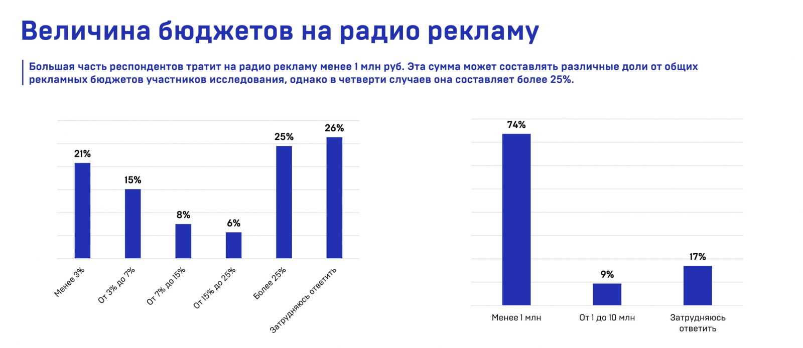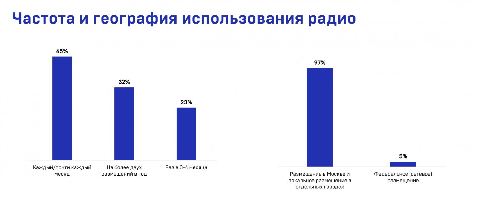 Большая часть респондентов тратит на радио менее 1 млн руб. В четверти случаев эта сумма составляет более 25% рекламного бюджета, а каждая пятая компани тратит на это менее 3% бюджета. Почти половина размещает ролики каждый месяц. При этом сетевым размещением пользуются всего 5% компаний — остальные закупают рекламу в Москве и локально в других городах.