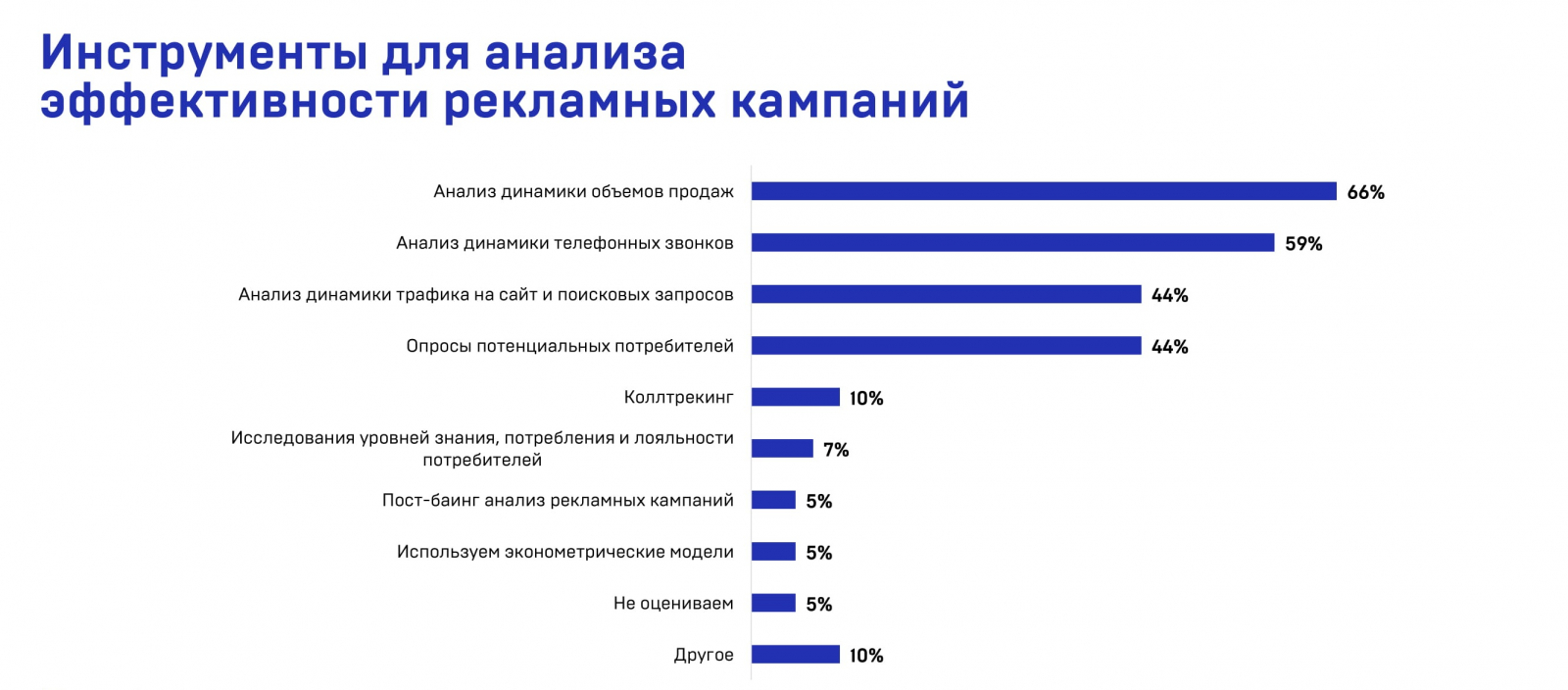 Для анализа эффективности кампании на радио 66% используют динамику объемов продаж, 59% - телефонные звонки, по 44% - трафик на сайт и опросы потребителей. При этом 5% респондентов никак не оценивает показатели радиорекламы.