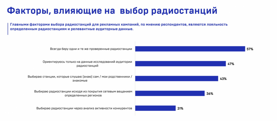 Согласно полученным данным, радио отличается высокой степенью лояльности со стороны рекламодателей. 57% респондентов постоянно закупают рекламу на одних и тех же проверенных радиостанциях, а 43% опрошенных выбирают те станции, которые слушают они сами или их знакомые.