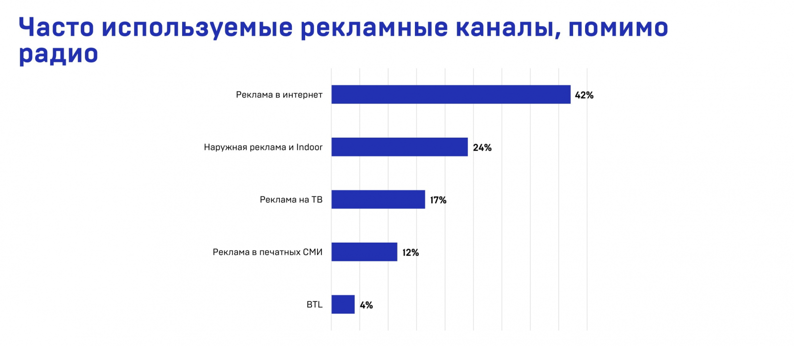 42% опрошенных в качестве альтернативного способа продвижения выбирают рекламу в Интернете, 38% рекламодателей сочетают digital-рекламу с радио. Аналитики АКАР отмечают тренд среди небольших рекламодателей — микс радио и digital.