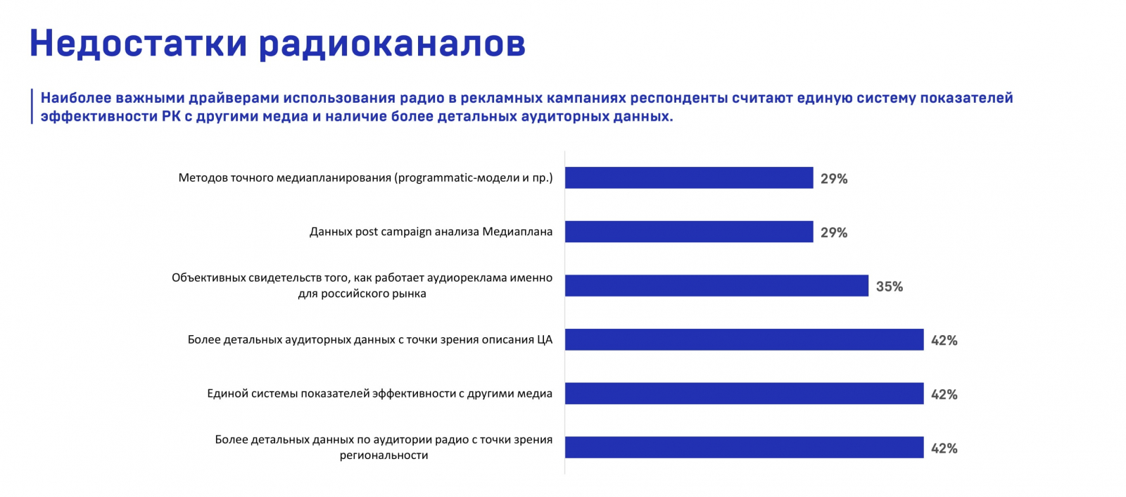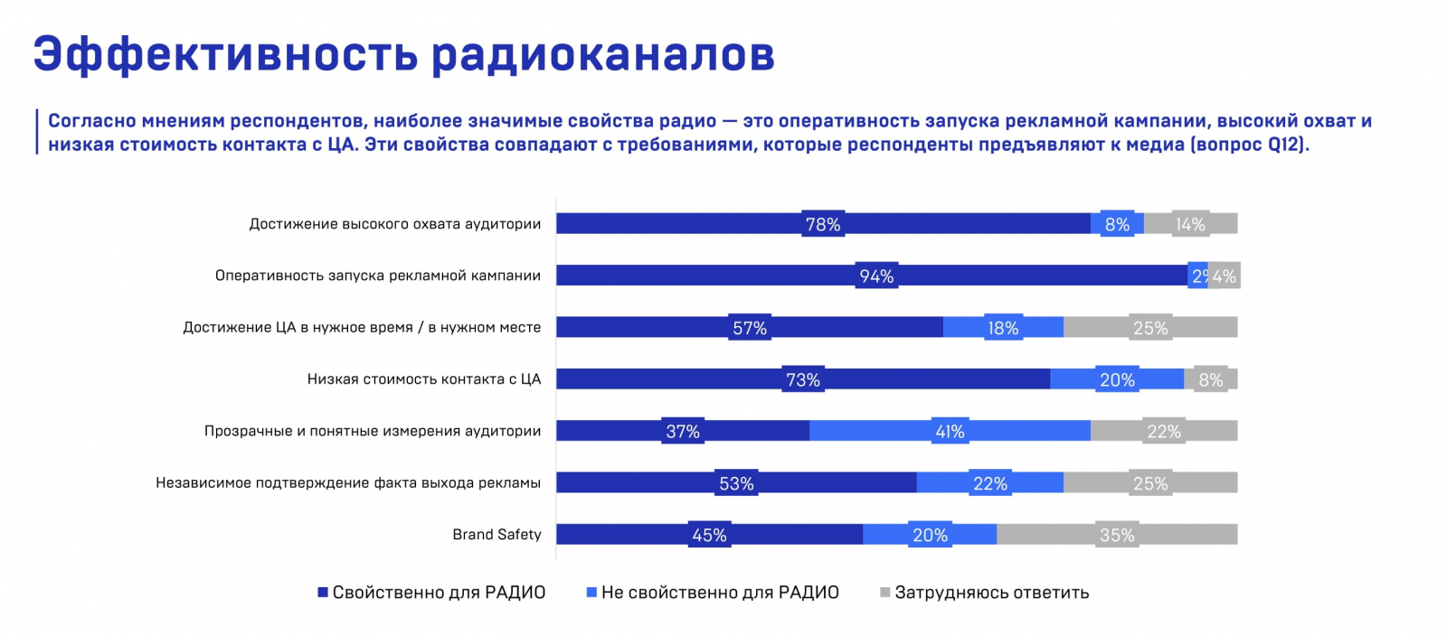 94% участников опроса ценят радио за возможность быстро разместить ролик и внести изменения в уже запущенную кампанию. 73% отметили низкую стоимость контакта с ЦА, при этом 90% считают, что радио усиливает эффект от других СМИ.