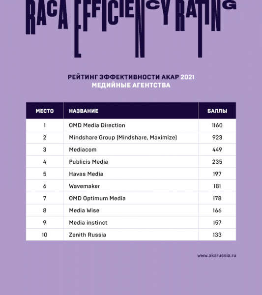 По итогам 2021 фестивального года в тройку лидеров рейтинга эффективности медийных агентств вошли OMD Media Direction с результатом 1160 баллов, Mindshare Group (Mindshare, Maximize), набравшее 923 балла, и Mediacom с 449 баллами.