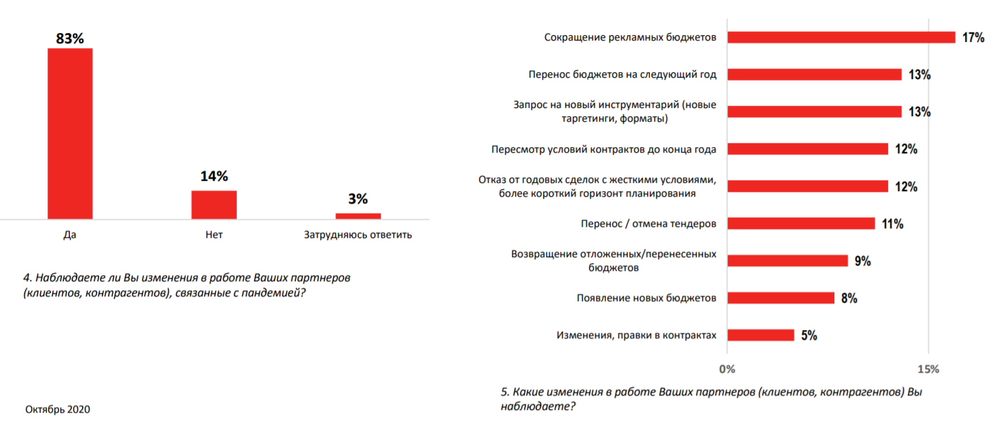 83% респондентов указывают на наличие изменений в работе их партнеров, связанных с пандемией. 17% из них отметили, что все еще наблюдают сокращение рекламных бюджетов.