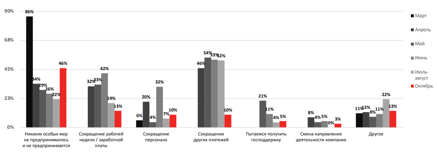 Однако улучшение стало возможно благодаря серьезным мерам по реструктуризации компаний. В том числе сокращению рабочей недели или заработной платы, ответили 13% опрошенных, а также сокращению штата сотрудников — 10% респондентов.
