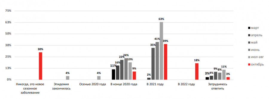 Доли респондентов, полагающих, что эпидемия закончится в конце этого года или в 2021 году сократились на 10 и 24 процентных пункта соответственно.