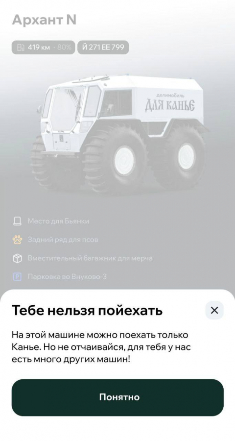 Каршеринг «Делимобиль» вдохновился визитом Канье Уэста в начале месяца и уже в ожидании его возвращения с концертом установил в Москве вездеход-арт-объект. «Архант N» хорошо знаком рэперу и уже был героем клипа. Белый снегоболотоход с надписью «Делимобиль для Канье», стилизованный под знаковый шрифт мерча рэпера, находится в открытом доступе на парковке московского пространства «Хлебозавод». Однако машину можно арендовать только легендарному исполнителю.