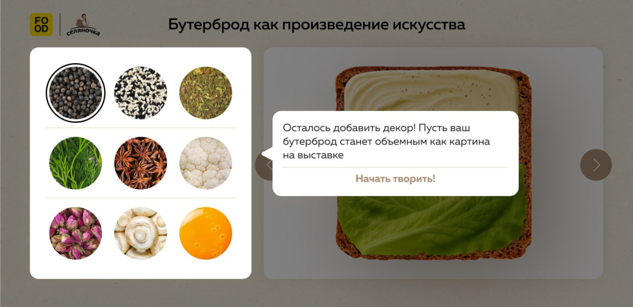 X5 Media ) и ТМ «Селяночка» нашли ответ, открыв виртуальную «Галерею съедобного творчества», где главные экспонаты — бутерброды. Среди них: «Завтрак Микеланджело», «Неизвестная картина Моне», «Розовое наваждение Дега» и «Детский рисунок да Винчи». Каждое фото на лендинге спецпроекта кликабельно и ведет на рецепт блюда.