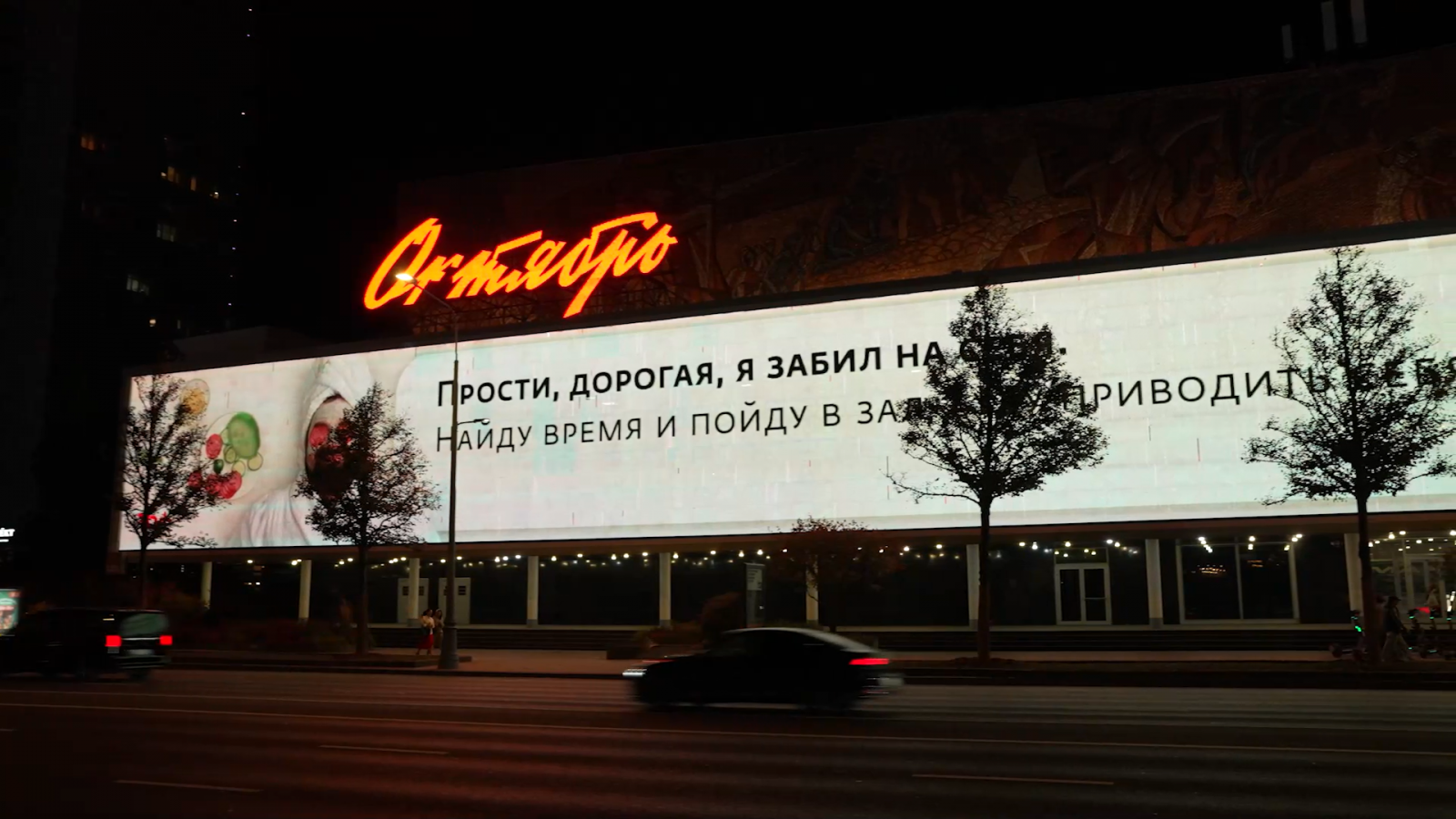 Телеканал «Ю» запустил кампанию в поддержку нового сезона реалити «Дорогая, я забил», где жены уезжают на четыре дня, а мужья берут на себя все домашние обязанности, чтобы понять масштаб труда партнерши. Канал предложил мужчинам публично извиниться и пообещать перемены: на специальном лендинге можно было оставить признание, а самые искренние сообщения, оформленные как уведомления в мессенджере, выводили на медиафасад кинотеатра «Октябрь» в центре Москвы.