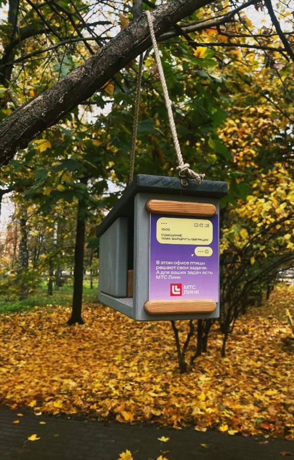 Агентство Dinamica x D Innovate Group разместило рекламу сервиса бизнес-коммуникаций «МТС Линк» на самых нестандартных OOH-носителях. В московских парках креатив появился на кормушках для птиц с сообщением: «В этом офисе птицы решают свои задачи. А для ваших задач есть "МТС Линк"». Ранее реклама сервиса была размещена на одном из самых больших носителей в мире — колесе обозрения в китайском Хэйхэ, где белка призывала побеждать рутину. Связка нестандартного OOH и digital усилила охват и показала: «МТС Линк» подходит для задач любого масштаба.
