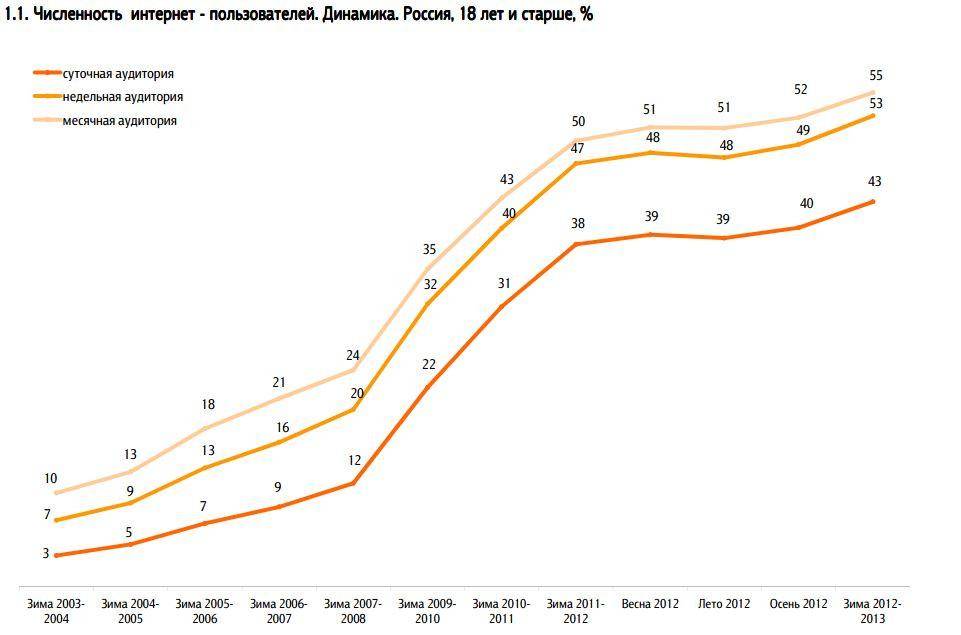 Доля активной аудитории интернета в России достигла 43%, тогда как зимой 2011–2012 годов этот показатель составлял 38%. Численность интернет-пользователей старше 18 лет, выходящих в Сеть хотя бы раз в сутки, выросла с 44,3 до 50,1 млн человек. Годовой прирост ежемесячной аудитории Рунета составил 11%, свидетельствует исследование Фонда «Общественное мнение».