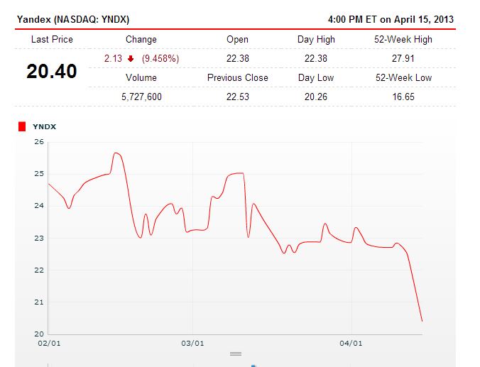 Акции «Яндекса» подешевели по итогам предыдущей сессии на 9,5%. Ценные бумаги компании торгуются на нью-йоркской бирже Nasdaq. На сайте «Яндекса» для инвесторов можно проследить динамику цен: на момент открытия стоимость акции составляла 22,53 доллара, 15 апреля – 22,38, а в течение дня котировки упали до 20,26. Последняя цена составила 20,4 доллара за штуку.
