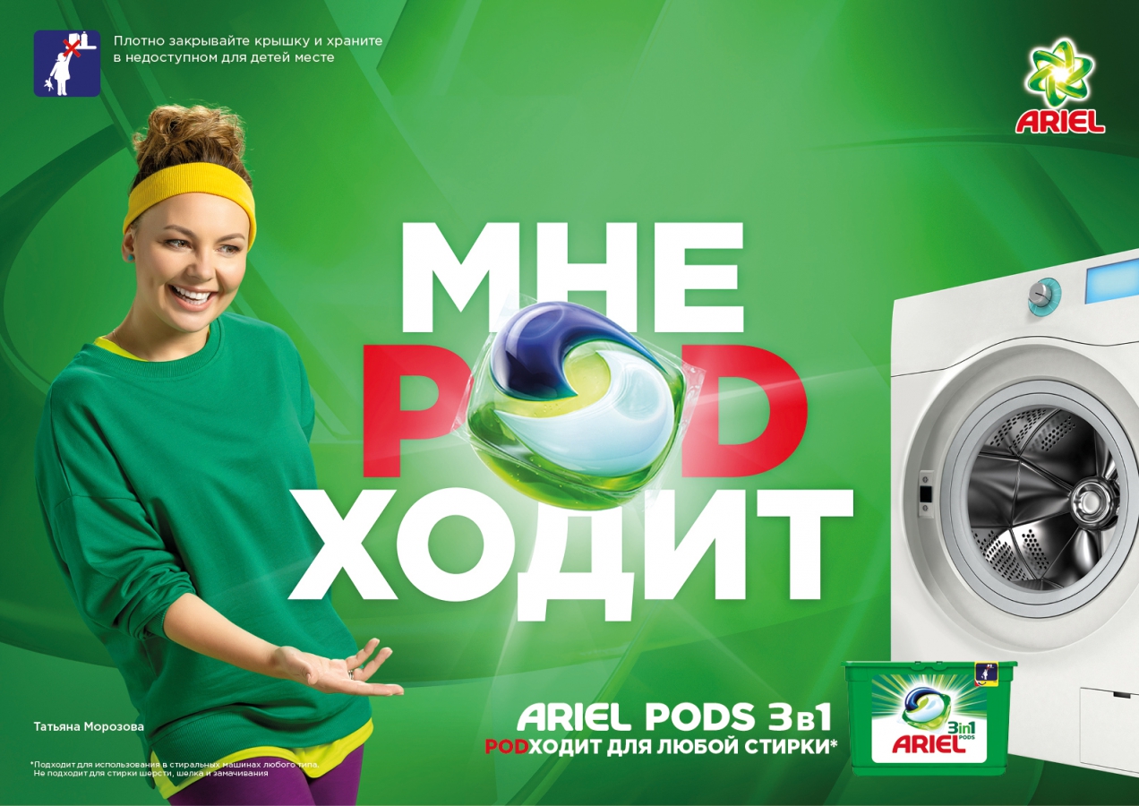 Кампания «Мне PODходит» в нестандартной форме доносит идею того, как инновационный продукт улучшает жизнь потребителей и делает ее более комфортной. Капсула Ariel PODs 3в1 очень проста в применении, дает безупречный результат стирки, и подходит для разного типа одежды, и именно этого хочет наш потребитель.