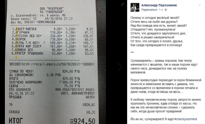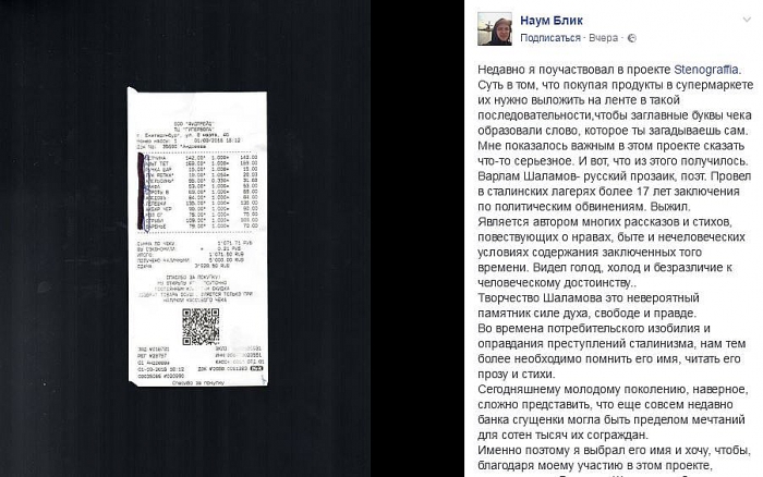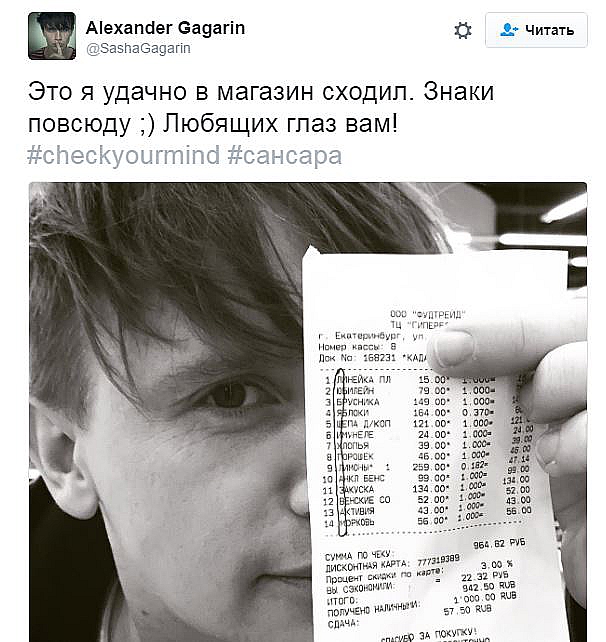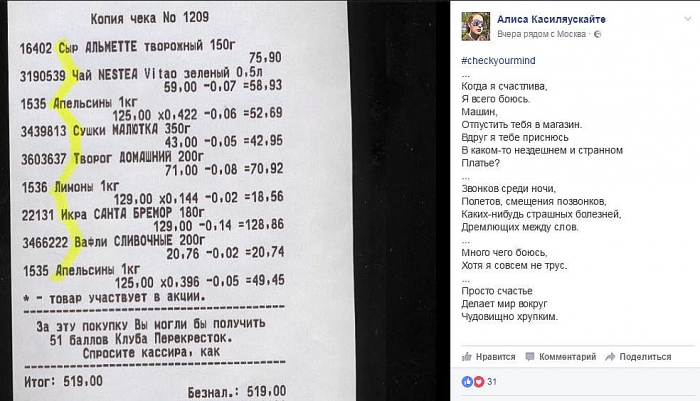 Обычный чек из супермаркета может стать стихотворением, акростихом, высказыванием о том, что действительно волнует человека. Творческий директор Grey Russia Александр Загорский, который недавно перешел из брендингового агентства Depot WPF, и фестиваль «Стенограффия» запустили проект #Checkyourmind, который превращает обычную покупку в игру, поступок и высказывание. Одним из источников вдохновения послужил издательский проект «Ультра.Культура», созданный в Екатеринбурге покойным Ильей Кормильцевым.