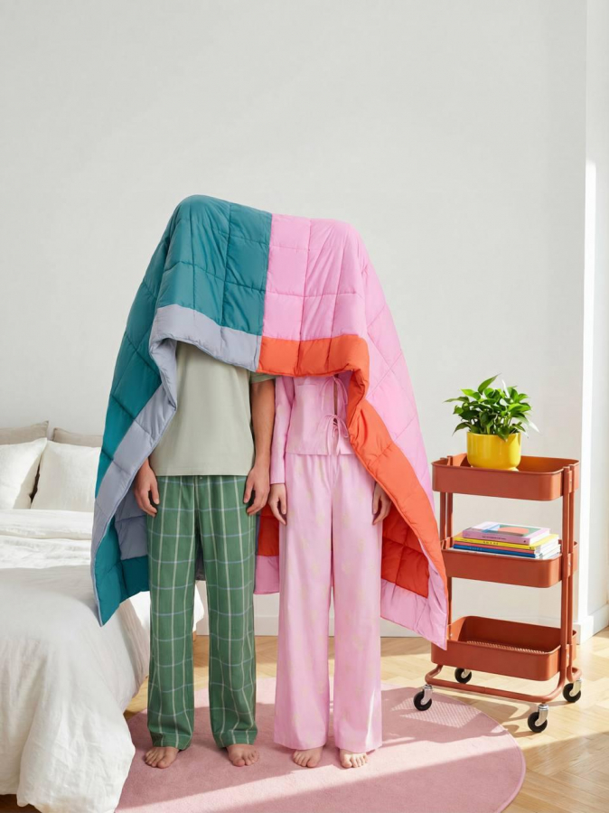 Один партнер мерзнет, другой не может заснуть из-за жары. Одеяло Duo состоит из двух половин — более теплой розовой и более легкой голубой, чтобы различия в предпочтениях не создавали трений в отношениях. Pragma не уходит от этой правды и не пытается превратить ее в красивую историю, а создает символ комфортного совместного быта.