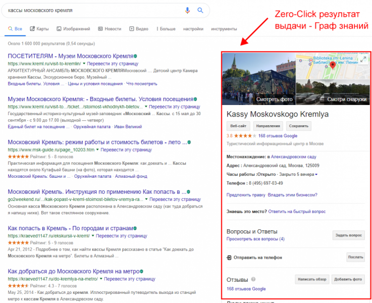 Одна из главных тенденций поисковой выдачи Google в 2019 году — увеличение доли zero-click результатов. Google старается дать ответ на вопрос пользователя уже на странице выдачи в блоке над органикой (Local Pack) или справа в виде графа знаний.