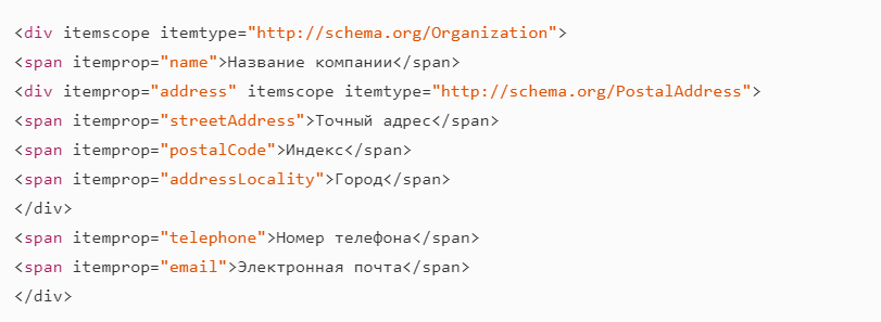 Ниже пример микроразметки контактных данных (достаточно заменить параметры на свои вместо «название компании», «город» и пр., и вставить в панели управления сайтом.