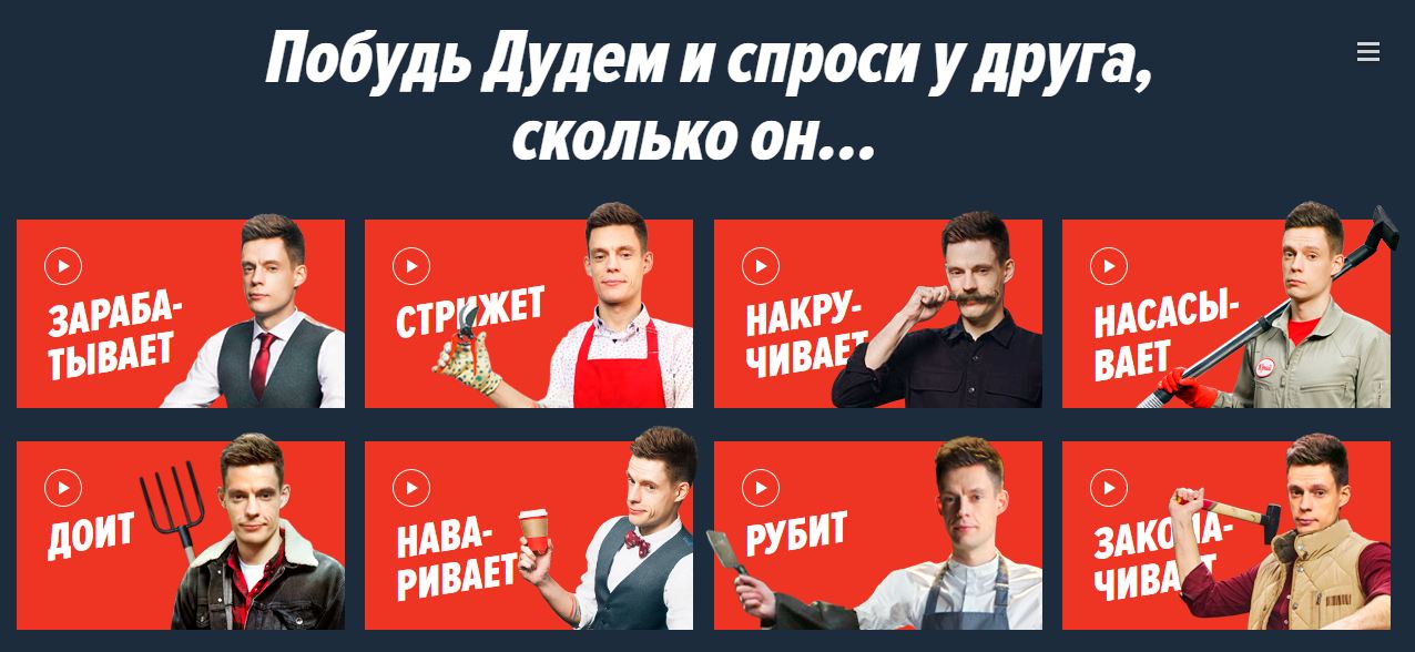 Кампания включает промосайт alfadud.ru, серию из 8 рекламных роликов и фирменный стикерпак для Telegram. В коротких видео Дудь задается вопросами «Сколько ты накручиваешь?», «Сколько ты навариваешь?», «Сколько ты насасываешь?», «Сколько ты доишь?», «Сколько ты стрижешь?», «Сколько ты рубишь?», «Сколько ты заколачиваешь?».