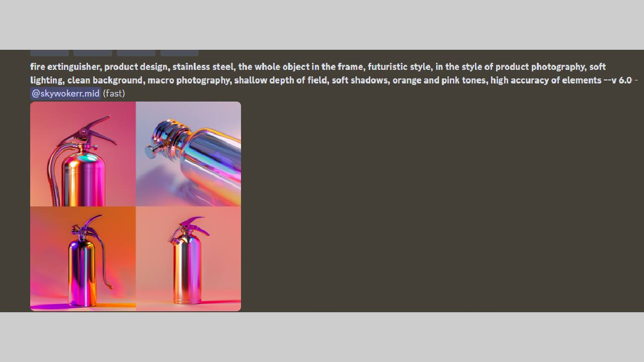 Рассмотрим на примере имиджа. Допустим, мы хотим получить изображение матового металлического огнетушителя, для использования его в Telegram. На первом месте идет описание того объекта, который будет основным на нашем имидже. Далее идет описание материала, цвета, света, положения в кадре, описание фона и окружения, стилистики изображения. В финале прописываем соотношения сторон для картинки. В Midjourney по умолчанию идет 1:1, то есть квадрат, нам это подходит.